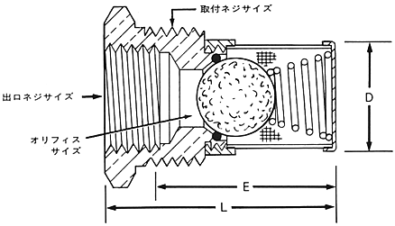 | 型番 | 最高圧力 MPa | 最高温度 °C | 取付ネジ サイズ | 出口ネジ サイズ | 全長 L | 組込み長 E | チューブ 外径D | 六角棒 サイズ | オリフィス サイズ | ボール 径 | 重量 g |